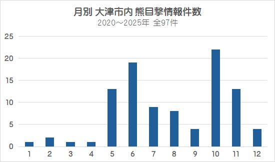 大津市HPに掲載されている過去の目撃情報を整理すると、下グラフの様に冬眠前後の10月~11月頃、5月~6月頃に多くの目撃情報が寄せられていることが判ります。目撃情報の多い時期の特に早朝夕方など、山と住宅地の境付近での歩行や屋外作業には十分ご注意ください。