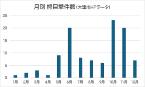 下は大津市HP掲載の令和2年以降、今年12月26日までの全ての目撃情報を月別、時間帯別にグラフ化したものです。