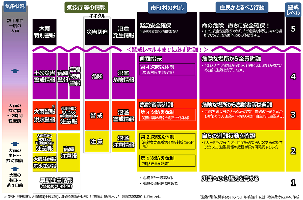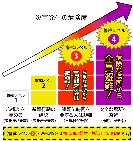 警戒レベルと避難について 2025-12-012025-12-22 hiyoshidai-jichiren 警戒レベルと災害発生危険度 避難行動について 段階的に発表される防災気象情報 クリックすると拡大表示されます 警戒レベル変更告知チラシ(令和3年5月20日)