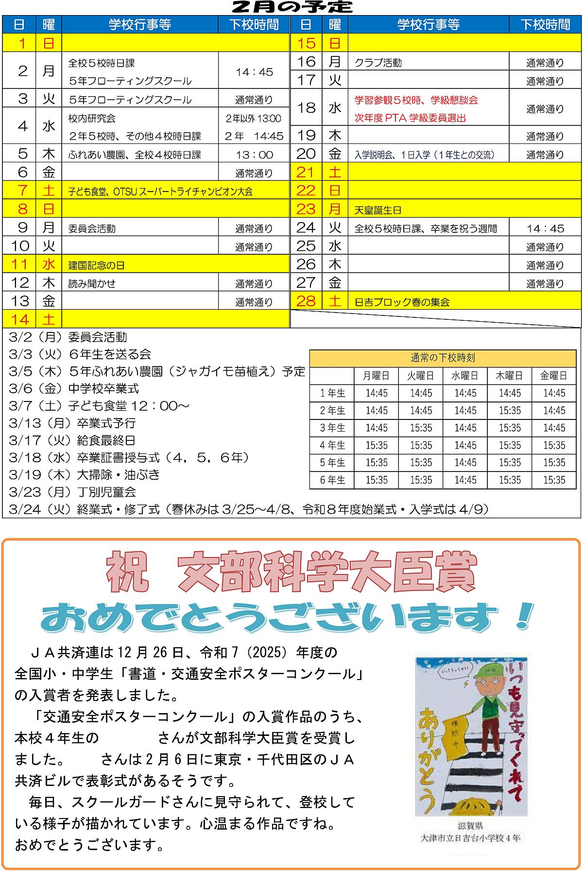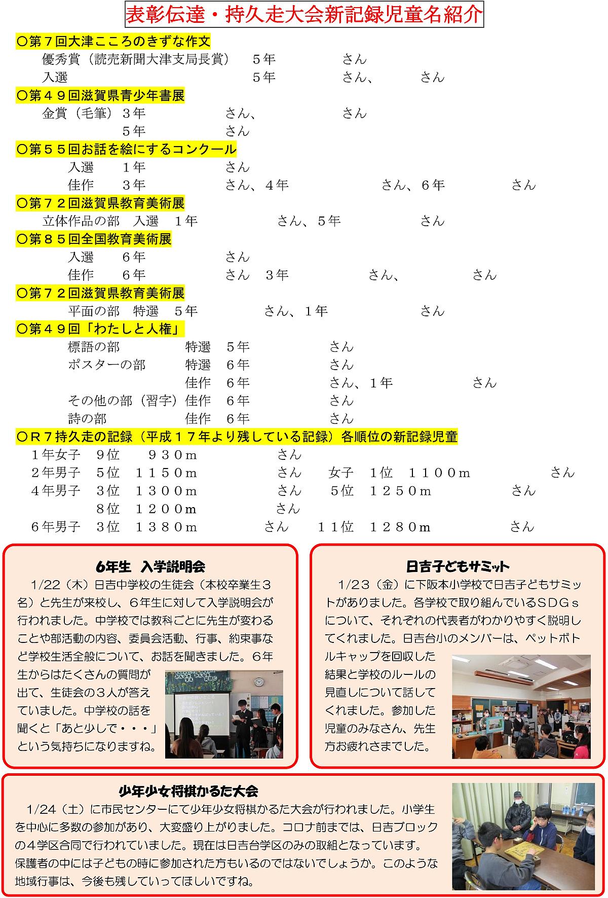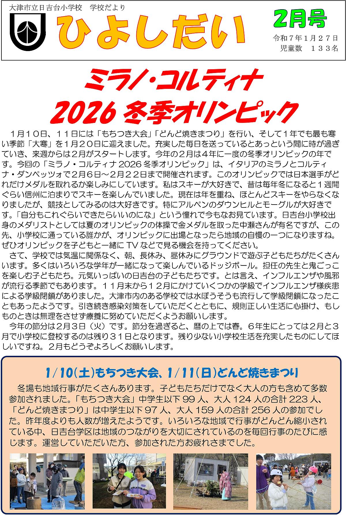日吉台小学校 学校だより 2月号 2026-01-29 hiyoshidai-jichiren ※ 文字が小さくて読みにくい場合はクリックして頂くと拡大表示されます。 ※ 個人情報保護の観点から一部児童のお名前が非表示となっています。